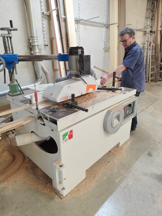 Les planches de bois vont alors suivre un circuit jusqu’à devenir des baguettes d’encadrement. Les planches sont d’abord rabotées puis délignées à la scie puis poncées avant que les toupies ne viennent dessiner un profil bien particulier sur la planche. Billebault est en mesure de façonner une infinité de profils différents si complexes soient-ils.